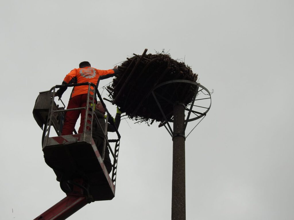 Das erste von drei neuen Storchennestern in Randau hat seinen Platz gefunden: