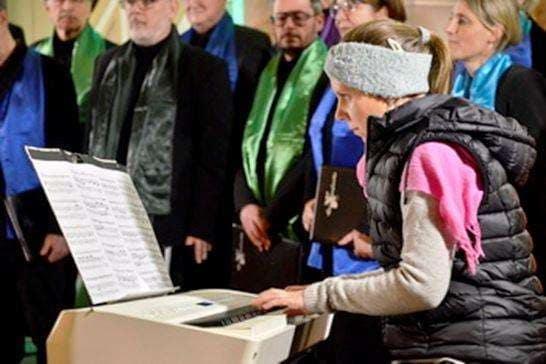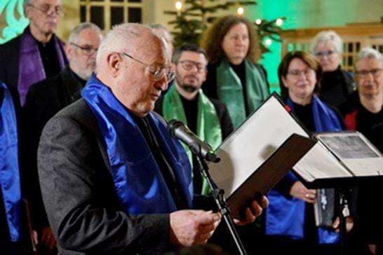 Das Lied „Ich brach drei dürre Reiselein“ von Hugo Distler (1904-1942) war dann eines der moderneren Stücke. „Wissen Sie, was Barbarezweige sind?“, fragte Frank Satzky das Publikum. Denn davon handelte der Text, von den Zweigen, die Anfang Dezember geschnitten und in die Vase gestellt, genau zu Weihnachten beginnen zu blühen. Ein Lied, das 1938, also mitten in der Zeit der Nazidiktatur veröffentlicht wurde und im Text nach einfacher Hoffnung sucht.