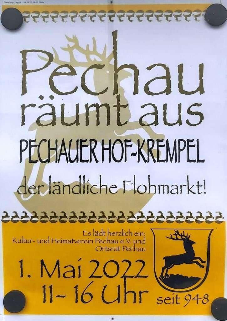 Am Sonntag, den 1.Mai ist es nun wieder so weit. Zwischen 11 und 16 Uhr präsentieren die Pechauer ihre Schätze auf bzw. vor ihren Bauernhöfen und Grundstücken. Auch in diesem Jahr haben wir wieder eine Rekordbeteiligung zu verzeichnen, ohne die anderswo üblichen professionellen Händler.