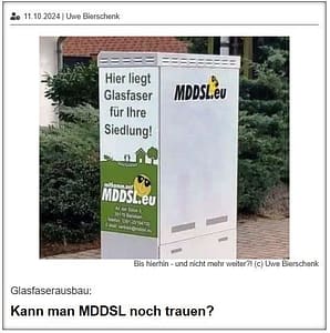 Sollten – denn genau damit lässt sich MDDSL viel Zeit. Die Anträge dafür schmoren seit 2021 in den Schubkästen des Unternehmens. Begründet wird das unternehmensseitig mit privatwirtschaftlichen Abwägungen. Da nämlich, wo Konkurrenten auf dem Markt sind, müsse man vorrangig tätig werden. Das heißt im Klartext genau das, was ein Randauer Bürger auf den Punkt brachte: Für Randau-Calenberge gibt es keinen Konkurrenten, das Gebiet ist MDDSL also sicher und es besteht hier keinerlei Handlungsdruck, den Ausbau (endlich) abzuschließen.