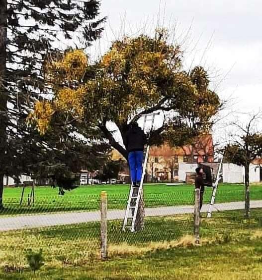 Doch zurück zu unseren Misteln. Die Obstbäume im Greifenwerder waren schon sehr stark befallen, da hier schon seit Ewigkeiten keine Pflege mehr erfolgte, schon gar kein Baumschnitt. Ein klarer Vorwurf an den Eigenbetrieb! Die drei Teams schafften es, in gut zwei Stunden 30 bis 40 Bäume von teils heftigem Befall zu befreien – ein ziemlich ordentliches Ergebnis. Allerdings hatte der „Spaß“ teilweise bei sehr hoch sitzenden Misteln ein Ende – Baumkletterei war viel zu gefährlich und die Länge der Leitern begrenzten die Arbeitshöhe. Dadurch konnten leider nicht alle Misteln entfernt werden.