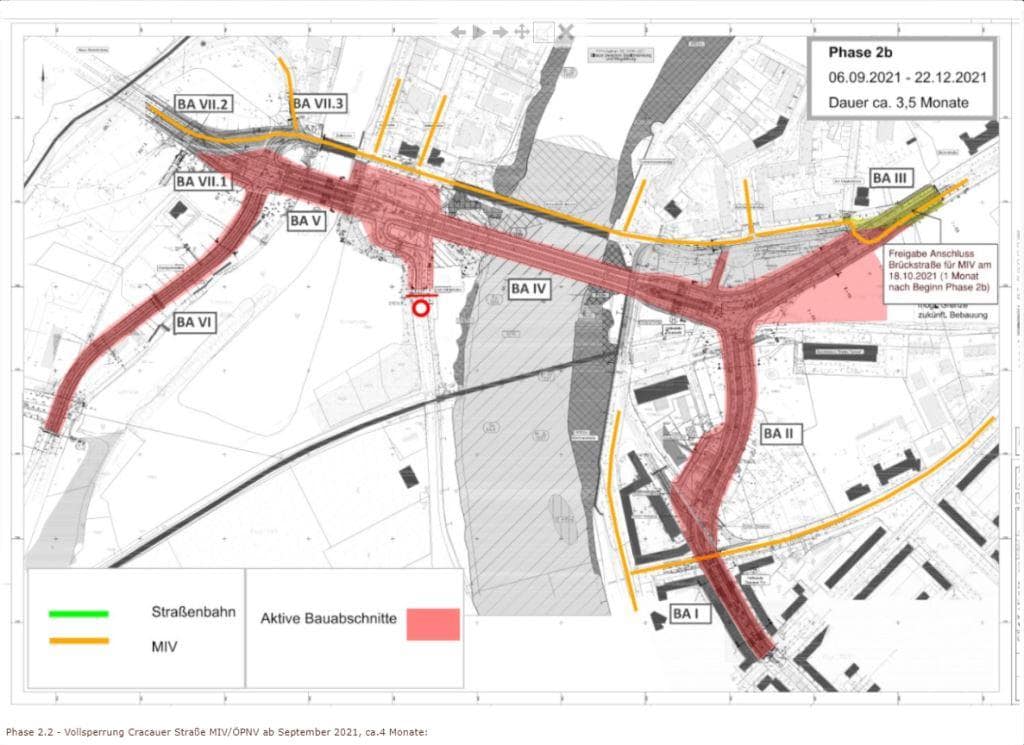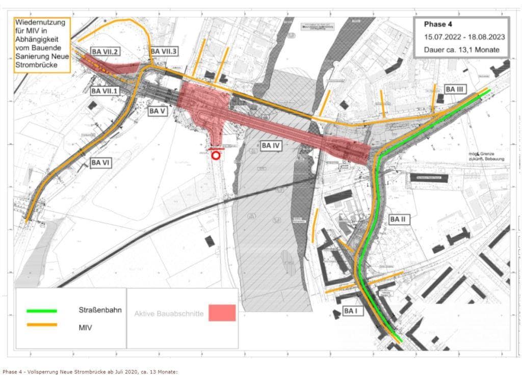 Mit dem heutigen Tag (02.07.2021 – d.Red.) ist die Verkehrsplanung in die nächste (zweite) Etappe eingetreten, die weitere Einschnitte für den Verkehr in Ostelbien mit sich bringt. Vom 4. Juli bis voraussichtlich zum 6. September ist die Brückstraße für den öffentlichen Personennahverkehr (ÖPNV) und den motorisierten Individualverkehr (MIV) voll gesperrt. Aber das ist nur die Spitze des Eisbergs, denn daran schließen sich weitere Sperrungen an. Besonders hart wird es ab Juli 2022, wenn dann die Neue Strombrücke saniert werden und deshalb für 13 (!) Monate komplett gesperrt werden muss.