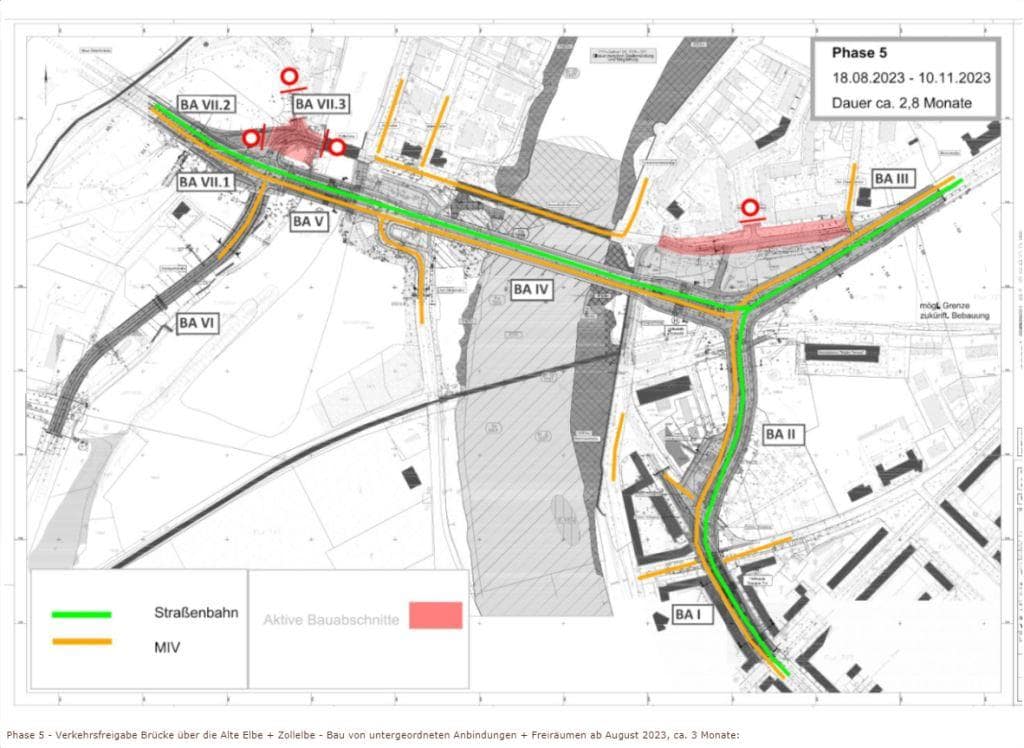 In das Großbauprojekt „Ersatzneubau Strombrückenzug“ sind insgesamt vier Bauwerke eingeschlossen. Neben der neuen Pylonbrücke über die Alte Elbe – die künftig die stark beschädigte Anna-Ebert-Brücke entlasten soll – gehören dazu auch die neue Brücke über die Zollelbe sowie die Sanierung der bestehenden Neuen Strombrücke und die Notsicherung der denkmalgeschützten Anna-Ebert-Brücke. Letztere stellt bis zur Freigabe des Ersatzneubaus eine von zwei wichtigen Verkehrsverbindungen nach Ostelbien dar. In verschiedenen Verkehrsphasen waren und werden Sperrungen und Umleitungen zur Umsetzung der Baumaßnahme von Nöten sein.