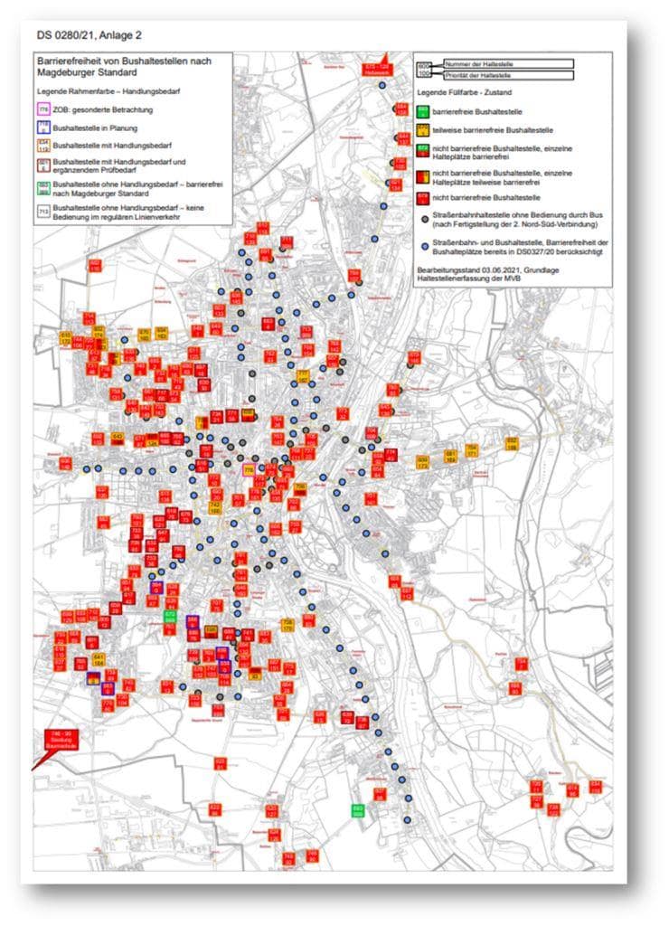 Aus den Anpassungsbedarfen und Kostenbewertungen wurden Prioritäten abgeleitet zur schrittweisen, koordinierten Realisierung des Magdeburger Standards. Daher wird in Ergänzung zur „Prioritätenliste – Herstellung barrierefreier Straßenbahnhaltestellen“ die „Prioritätenliste – Herstellung barrierefreier Bushaltestellen“ im gesamten ÖSPV im Bereich der Aufgabenträgerschaft der Landeshauptstadt Magdeburg zur Beschlussfassung vorgelegt (siehe Anlagen). Beide Prioritätenlisten bilden die Grundlage für die laut Beschluss-Nr. 178-004(VII)19 vorzunehmende haushaltsrechtliche Einsteuerung von jährlich 5 Mio. Euro durch Aufteilung auf konkrete Maßnahmen. In Magdeburg gibt es derzeit 222 durch Busse bediente Haltestellen. Davon werden 60 sowohl durch Straßenbahnen und Busse und 162 ausschließlich durch Busse bedient. Eine Haltestelle kann aus mehreren Halteplätzen bestehen. Die Anzahl der zu betrachtenden Halteplätze stellt sich folgendermaßen dar (Stand Dezember 2020, nach Eröffnung Bauabschnitt 7 der 2. Nord-Süd-Verbindung):
