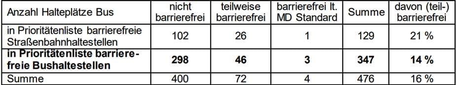 Wie auch bereits bei den Straßenbahnhaltestellen wurden auch bei der Überprüfung der Bushaltestellen erhebliche Defizite hinsichtlich der barrierefreien Ein- und Ausstiegsmöglichkeiten erkannt, die nun schrittweise abgebaut werden sollen.