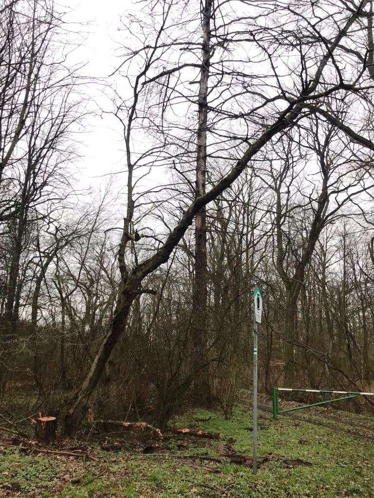 Eine Einzelbaumprüfung und Kennzeichnung der zu fällenden Bäume erfolgte nicht. Beispiel gefällig? Pechau, Einfahrt in die Kreuzhorst zwischen Sportplatz und Friedhof, Höhe Schlagbaum. Auf der linken Seite wurde eine etwa 15jährige, kerngesunde und standsichere Wildkirsche grundlos gefällt. Gegenüber auf der rechten Seite hängt noch immer ein – seit drei Jahren totes – Exemplar derselben Art.