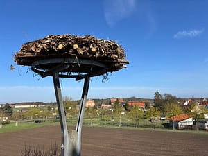 Nachdem am 14. März das erste Nest auf seinem Platz auf dem Mast in der AGRAR-GmbH fand, ist mit Hilfe der Berufsfeuerwehr Magdeburg am vergangenen Gründonnerstag das zweite Nest aufgesetzt worden, und zwar in der Schlossstraße.