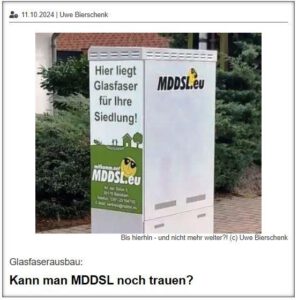 Die belügen uns seit Jahren, versorgen unzuverlässig, nehmen im Verhältnis zur erbrachten Leistung unverschämte Preise und ich prophezeie, das wird auch 2025 nichts mit der Glasfaser.