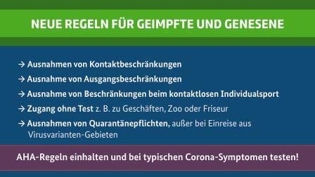 - Kontakt- und Ausgangsbeschränkungen gelten nicht mehr für Geimpfte und Genesene. Damit werden zum Beispiel bei privaten Zusammenkünften geimpfte und genesene Personen nicht mehr mitgezählt. Auch nächtliche Ausgangsbeschränkungen nach dem Infektionsschutzgesetz entfallen für diese Personengruppen.
