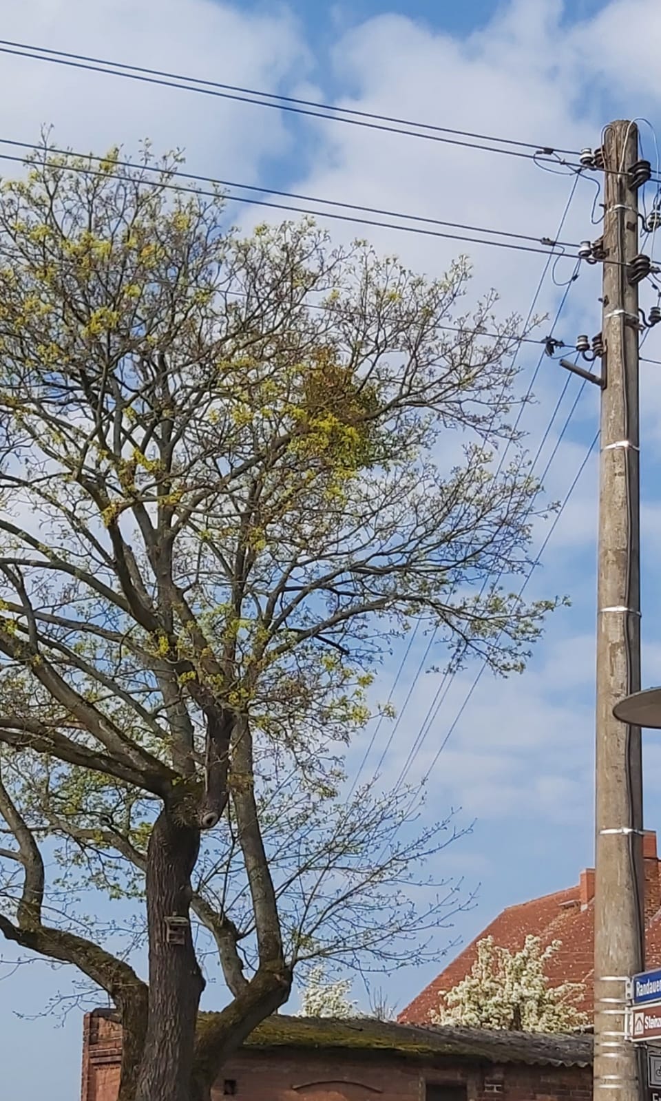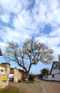 Wenn man von der Randauer Dorfstraße ortsauswärts geradeaus weiterfahren würde, stünde man auf dem sog. „Großen Hof“. Der riesige, direkt am Eingangsportal befindliche, uralte Baum stellt eine erhebliche Gefährdung für die Freileitungen dar. Für die auf dem Hof selbst befindlichen Bäume gilt das Gleiche. Das Problem ist jedoch die Eigentumsfrage: Da sich das Grundstück in Privatbesitz befindet, müsste der nicht in Deutschland wohnhafte Eigentümer einer Beschneidung zustimmen und vor allem: bezahlen, doch er reagiert auch auf mehrfache Anfragen überhaupt nicht. Daher soll nun eine Anfrage an die Stadt wegen Gefährdung der Freileitungen Klarheit über die Verfahrensweise geben. Möglicherweise könnte der Baumbeschnitt von der Landeshauptstadt beauftragt und ihm in Rechnung gestellt werden.