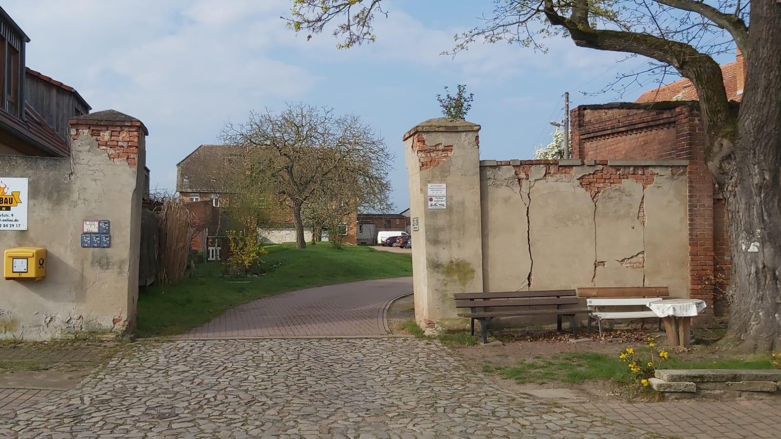Ähnlich sieht es bei der rechten Torsäule aus: sie hat sich bedenklich zur Seite geneigt, was wiederum erhebliche Risse in der anschließenden Wand zur Folge hat. Eine statische Gefährdung muss fachlich geprüft werden.