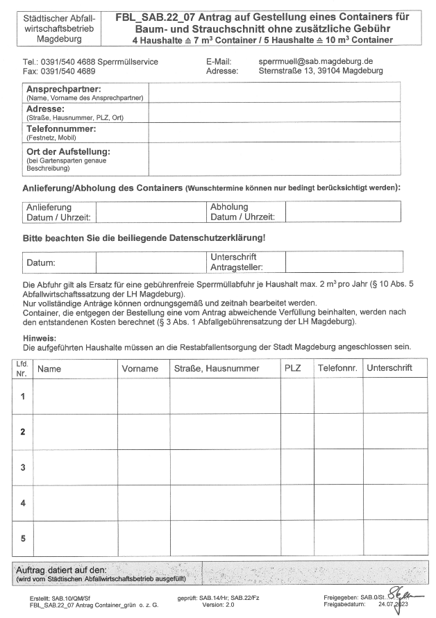 Betriebsleiter des Städtischen Abfallentsorgungsbetriebes (SAB) Herr Andreas Stegemann aus und benannte die bestehenden Möglichkeiten der Laubentsorgung, zu der alle Privathaushalte gemäß Straßenreinigungssatzung verpflichtet sind. So sind zusätzlich zu den Biotonnen auch Laubsäcke (Stck. 2,80€) erhältlich. Daneben stehen die kostenlose Entsorgung auf den Wertstoffhöfen und – etwas weniger bekannt – die Anforderung von 7 bzw. 10m³ -Containern dafür als Möglichkeiten offen. Für diese kostenlosen Container müssen sich lediglich vier bzw. fünf Grundstücksparteien zusammentun und auf eine von zwei kostenlosen jährlichen Sperrmüllentsorgungen verzichten.