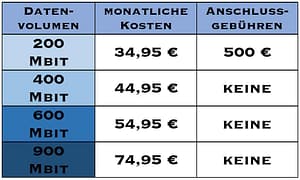 Die in der Tabelle aufgeführten Preise sind die reinen Tarife für das schnelle Internet. Die bisherigen Kombipakete von Internet und Telefonie werden durch einen modularen Aufbau ersetzt, d.h., dass zu den beispielsweise 44,95€ Glasfaserkosten noch einmal 9,95€ für das Modul Telefonie hinzukommen.