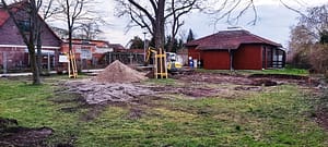 Zunächst werden die bestehenden, in die Jahre gekommenen, Ausstattungselemente und Spielgeräte demontiert und die alte Sandspielfläche zurückgebaut. Die vorhandenen Bänke werden eingelagert und sollen im aufgearbeiteten Zustand wieder ihren Platz auf dem fertiggestellten Spielplatz finden. Nachdem die Tiefbauarbeiten abgeschlossen sind, wird auf den unbefestigten Flächen Rasen angesät. Neben den Bänken im Umfeld wird ein Aufenthaltsbereich bestehend aus zwei weiteren Bänken, einem Tisch und einem Abfallbehälter angelegt. Die bereits vorhandenen Pflanzflächen werden in diesem Bereich ergänzt und neu bepflanzt.