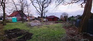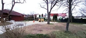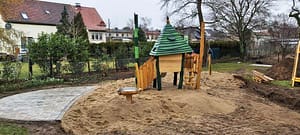 In Abhängigkeit der Witterungsverhältnisse soll in den nächsten Wochen auf der Spielfläche in Randau ein Kleinkindspielplatz mit Spielgeräte für Kinder bis fünf Jahren entstehen. Hierfür wird ein Spielhäuschen mit einer Edelstahlrutsche das Hauptspielelement bilden. Diese Spielhaus greift das Thema “Wald” dahingehend gestalterisch auf, dass es sich mit seinem grünen mit Blättern verzierten Dach und einer organisch anmutenden Balustrade aus natürlichem Robinienholz dem alten Baumbestand auf der Fläche anpasst. Auf grünen Stelzen stehend, runden liebvolle Gestaltungselementen, wie Blüten und ein Rabe das Ensemble ab.