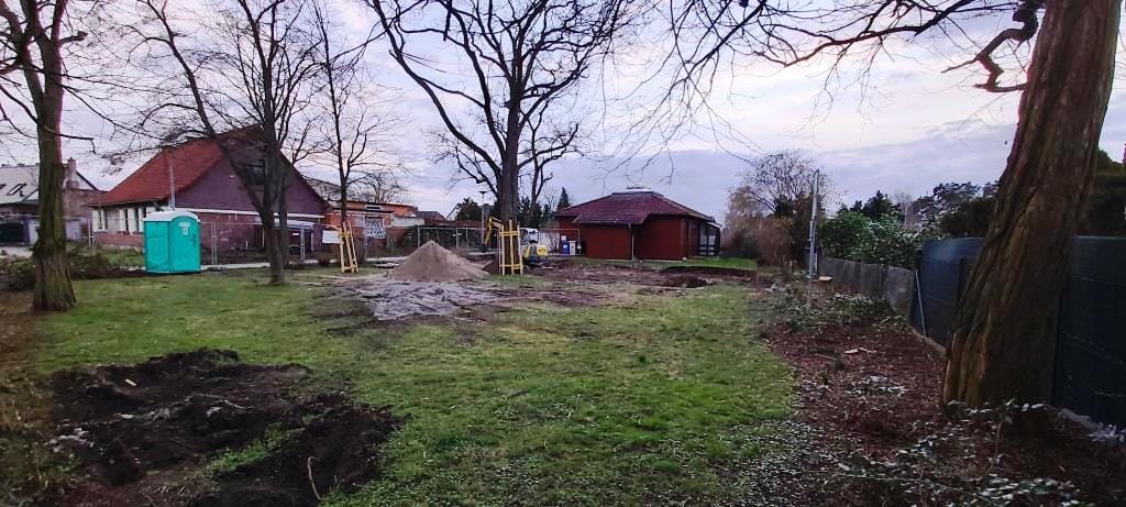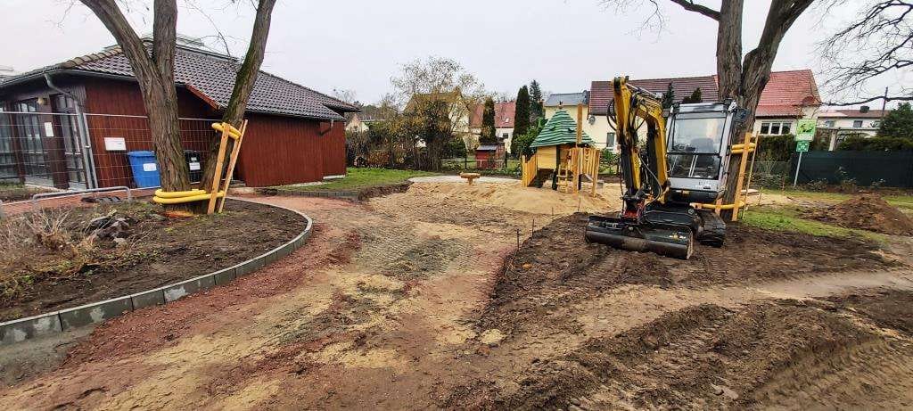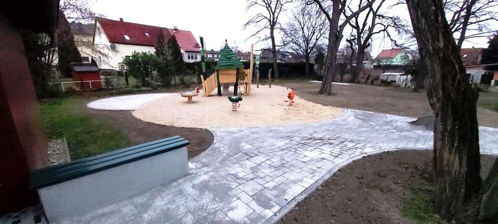 Zunächst werden die bestehenden, in die Jahre gekommenen, Ausstattungselemente und Spielgeräte demontiert und die alte Sandspielfläche zurückgebaut. Die vorhandenen Bänke werden eingelagert und sollen im aufgearbeiteten Zustand wieder ihren Platz auf dem fertiggestellten Spielplatz finden. Nachdem die Tiefbauarbeiten abgeschlossen sind, wird auf den unbefestigten Flächen Rasen angesät. Neben den Bänken im Umfeld wird ein Aufenthaltsbereich bestehend aus zwei weiteren Bänken, einem Tisch und einem Abfallbehälter angelegt. Die bereits vorhandenen Pflanzflächen werden in diesem Bereich ergänzt und neu bepflanzt.