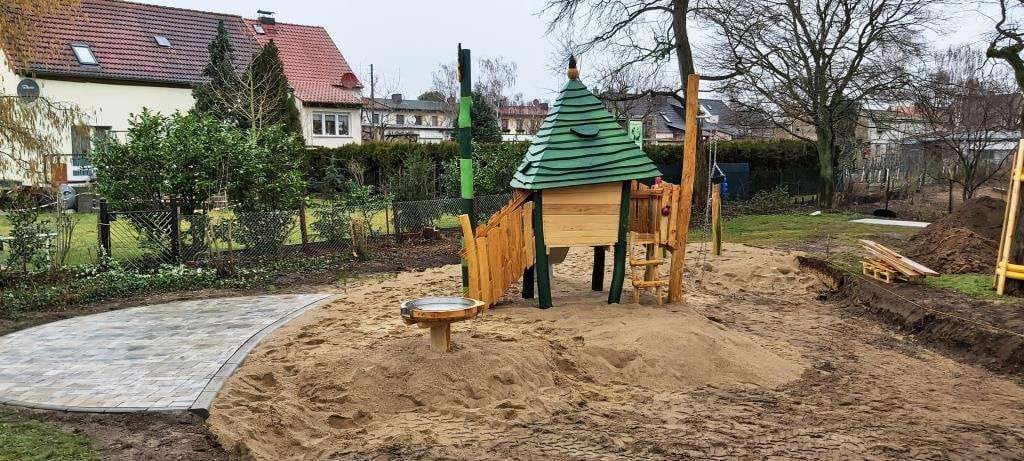 In Abhängigkeit der Witterungsverhältnisse soll in den nächsten Wochen auf der Spielfläche in Randau ein Kleinkindspielplatz mit Spielgeräte für Kinder bis fünf Jahren entstehen. Hierfür wird ein Spielhäuschen mit einer Edelstahlrutsche das Hauptspielelement bilden. Diese Spielhaus greift das Thema “Wald” dahingehend gestalterisch auf, dass es sich mit seinem grünen mit Blättern verzierten Dach und einer organisch anmutenden Balustrade aus natürlichem Robinienholz dem alten Baumbestand auf der Fläche anpasst. Auf grünen Stelzen stehend, runden liebvolle Gestaltungselementen, wie Blüten und ein Rabe das Ensemble ab.