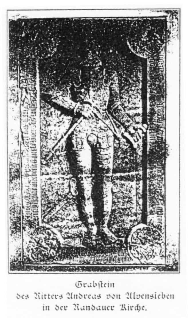 Die Verdienste des Andreas von Alvensleben um Kirche und Dorf wurden von der Gemeinde gebührend gewürdigt. „Er lieget in der kirchen zu Randau bey den altar begraben, wie der leichen oder grabstein ausweiset.“ Dieser gut erhaltene Grabdeckel stand früher in einer Nische der Turmmauer, bis er 1886 im Westeingang seinen Platz fand. Andreas zeigt sich uns in ganzer Gestalt, geharnischt, die Streitaxt in der Rechten. Die Ecken sind durch Wappen verziert. Die Inschrift lautet: