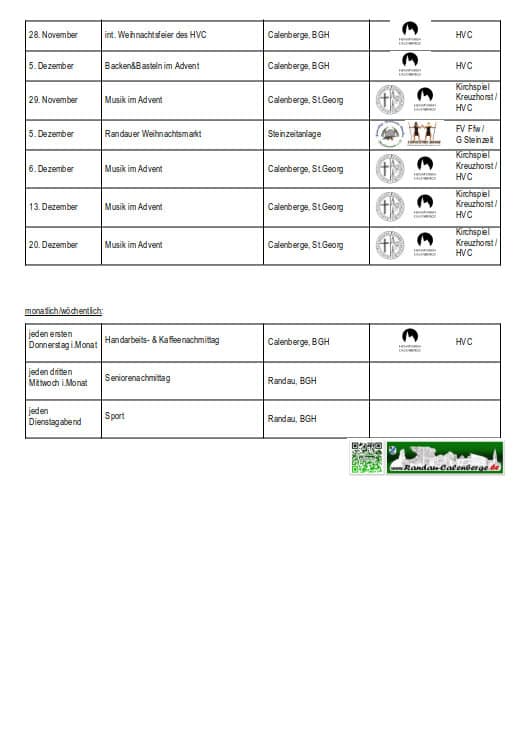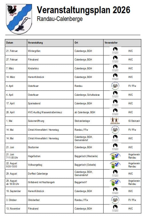 Veranstaltungsplan Randau-Calenberge 2026